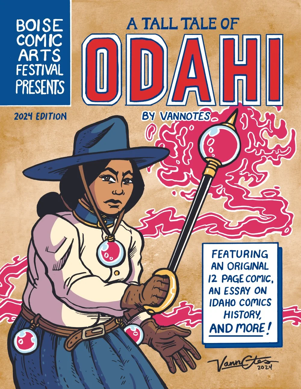 In 2024, Boise Comic Arts Festival debuted a new publication called Boise Comic Arts Festival Presents! This giveaway at BCAF features different Idaho creators and/or stories set in Idaho. Contributions included “Here There Be No Dragons,” the first comic set in the world of Odahi, which premiered the year prior at the festival’s “Dungeons and Drawing” panel. In the comic, readers were introduced to Rosa, Thorn of War, and Sheriff Grimtusk for the first time.